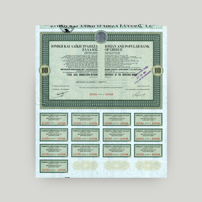 The Popular Bank 25-share stock certificate belongs to Alpha Bank’s collection of rare debt securities, shares and bonds.