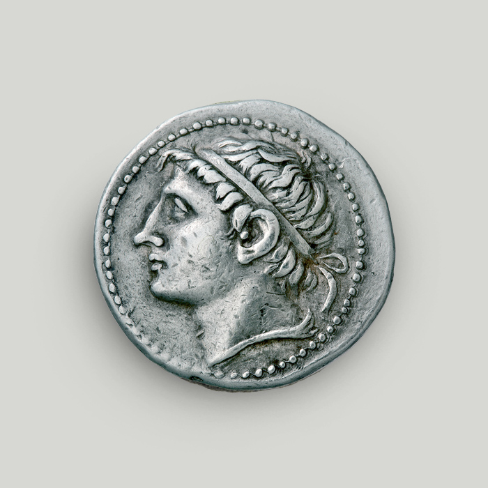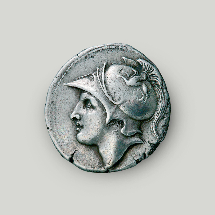 In 479 BCE, following their victory over the Persian army, the Athenians added new elements to their tetradrachm. On the obverse, the goddess’ helmet was adorned with flowers and olive leaves. On the reverse, a crescent was added under the olive branch – a branch from Athena’s sacred tree.